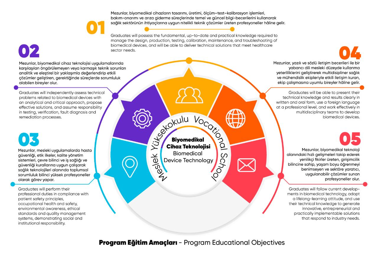 Mezunlar, biyomedikal cihazların tasarımı, üretimi, ölçüm–test–kalibrasyon işlemleri, bakım-onarımı ve arıza giderme süreçlerinde temel ve güncel bilgi-becerilerini kullanarak sağlık sektörünün ihtiyaçlarına uygun nitelikli teknik çözümler üreten profesyoneller hâline gelir. Graduates will possess the fundamental, up-to-date and practical knowledge required to manage the design, production, testing, calibration, maintenance, and troubleshooting of biomedical devices, and will be able to deliver technical solutions that meet healthcare sector needs. |